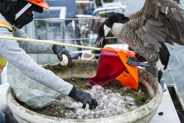 City of Vancouver wildlife technician Ziggy Jones collects eggs from a Canada goose nest, while another city worker holds the mother goose at bay.Jesse Winter/The Globe and Mail