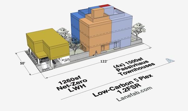 The diagram shows how, under the proposed rules, a 50x122 lot with the 'climate friendly' density bonus could be redeveloped to include four townhouses and a lane house.Lanefab Design / Build