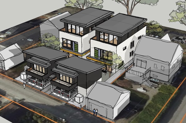 Vancouver city council is considering a plan to eliminate single-family zoning on land traditionally reserved for single-detached dwellings and allow people to build up to six units on residential lots. Rendering shows two 33x122 lots, each with a triplex.Lanefab Design / Build
