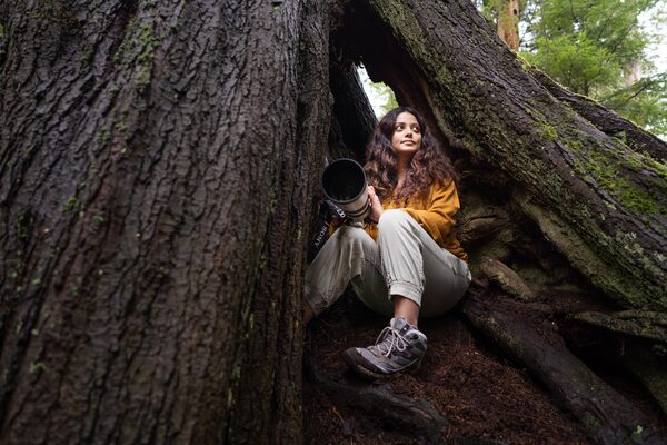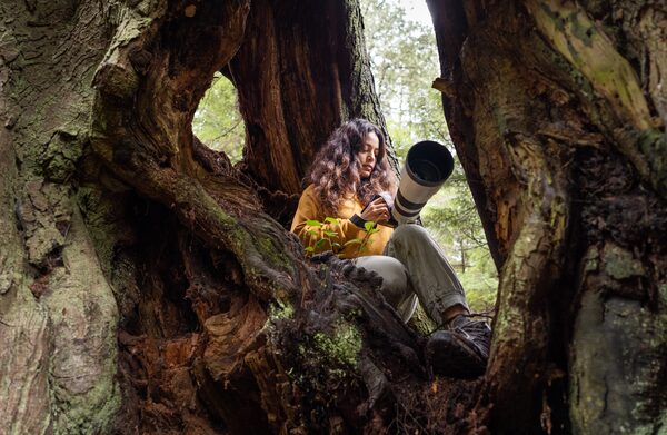 Wildlife filmmaker Gunjan Menon sits in a tree in Stanley Park in Vancouver, on April 10. Menon said she first moved to the city last February, immigrating from India. 'I wanted to be close to nature,' she said, noting that photos of the large park, which is also a natural rainforest, are what drew her to the west coast.Kayla Isomura/the Globe and Mail