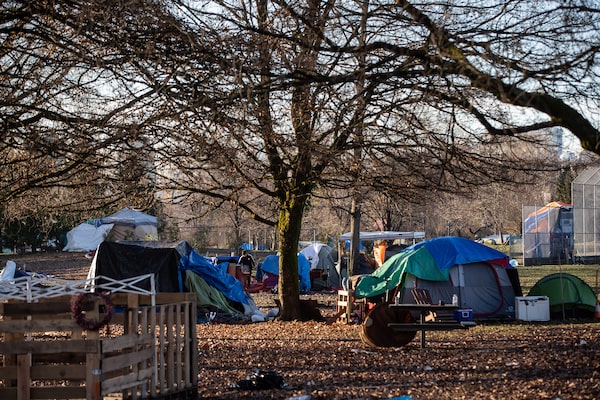 Tents are seen at a homeless encampment at Strathcona Park, in Vancouver, on Dec. 4, 2020.DARRYL DYCK/The Globe and Mail