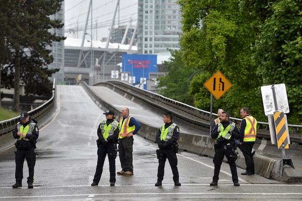Vancouver police monitor a Black Lives Matter protest against racial inequality in Vancouver on June 15, 2020.JENNIFER GAUTHIER/Reuters