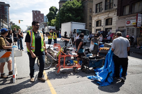 A person's belongings are placed on the street to be moved to storage after his tent was cleared from the sidewalk at a sprawling homeless encampment on East Hastings Street in the Downtown Eastside of Vancouver on Aug. 9, 2022.DARRYL DYCK/The Canadian Press