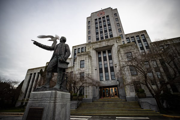 A seagull takes flight off a statue of Captain George Vancouver outside Vancouver City Hall, on Jan. 9, 2021.DARRYL DYCK/The Canadian Press