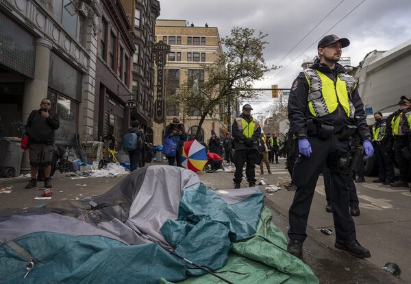 A member of the Vancouver Police Department stands next to an individual inside a tent along East Hastings Street in Vancouver on April 5 as city staff were seen removing encampments in the Downtown Eastside neighbourhood.Kayla Isomura/the Globe and Mail