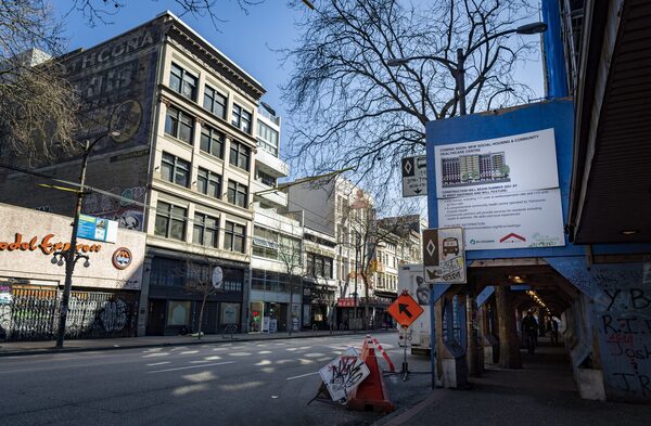 A sign announcing new social housing and a community healthcare centre hangs atop scaffolding across the street from 53 West Hastings Street on March 27.Kayla Isomura/The Globe and Mail
