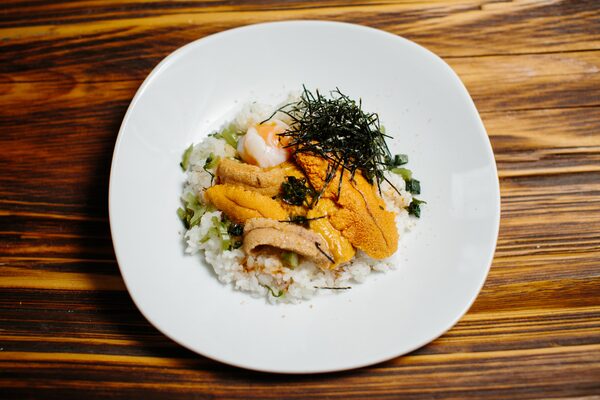 Red and green uni with rice at The Ugly Dumpling, Vancouver.BEN NELMS