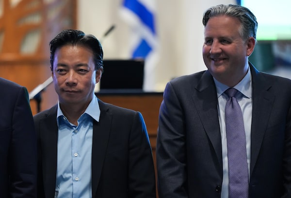 Ken Sim, left, who has been elected Mayor of Vancouver defeating Kennedy Stewart, right, stand together before a town hall in Vancouver, on September 7, 2022.DARRYL DYCK/The Canadian Press