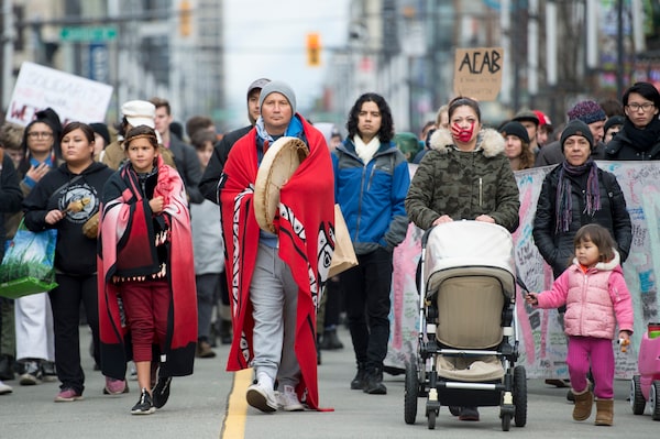 Protesters who stand in solidarity with the Wet'suwet'en hereditary chiefs march down Granville Street in downtown Vancouver, on Feb. 12, 2020.JONATHAN HAYWARD/The Canadian Press