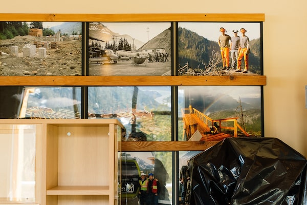 At top, an information board about the region's geological history stands near the top of the gondola. The summit is also home to a restaurant and bar, shown at bottom being prepared for reopening.Photos: Alana Paterson/The Globe and Mail