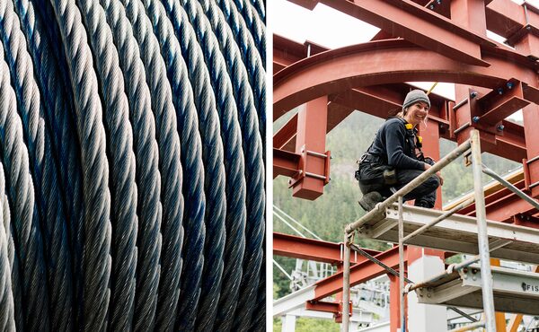 At top, a team from Fatzer AG, the cable's Swiss manufacturer, pulls the new cable into the Squamish gondola's system and splices it into the existing cable. Left-over cable, bottom left, has been prelaced again. At bottom right, millwright Marie-Eve Harvey climbs on the new infrastructure to remove and park the gondolas overnight.Photos: Haley Lorraine Photography; Alana Paterson/The Globe and Mail