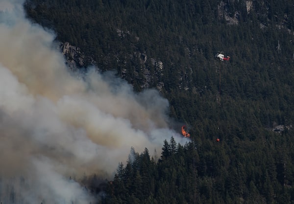 A helicopter carrying a water bucket flies past a wildfire near Lytton Creek, B.C., in 2021.DARRYL DYCK/The Canadian Press