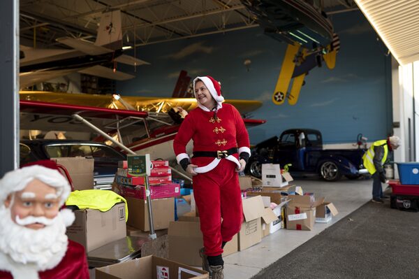 Team dispatch manager Brenda Lennax, dressed in a Santa suit, co-ordinates the donated gifts and supplies to be flown out.