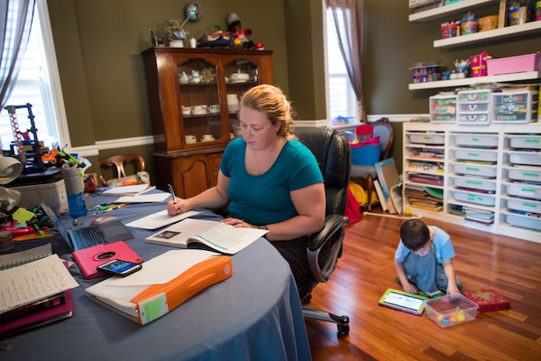 Sarah Beattie, who is earning a bachelor degree in human resources online from Athabasca University, studies at home while her son Clarke Beattie, 5, watches a video at their Langley, B.C., home. It's a typical set-up for the busy mother of three.DARRYL DYCK/The Globe and Mail