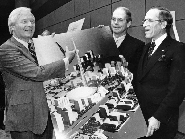 Ontario Premier William Davis points to the CN Tower when asked where his seat will be in the new domed stadium on Jan. 17, 1985.JEFF WASSERMAN/The Globe and Mail