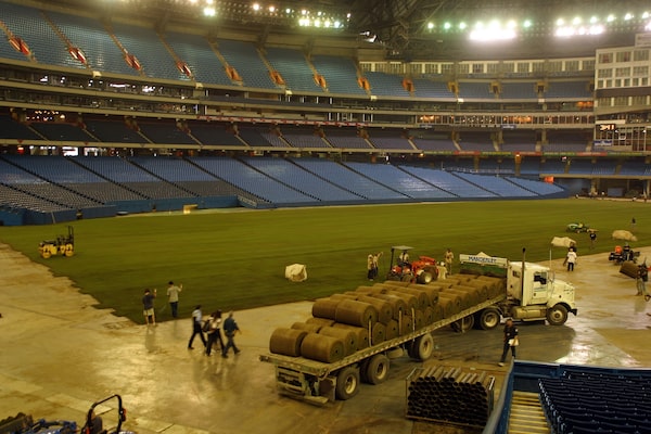 A group of workers installs natural grass for soccer matches as part of the 2004 Champions World Series. For most sports including baseball, games at Rogers Centre are played on artificial turf.Fernando Morales/The Globe and Mail