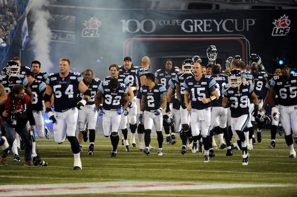 The Toronto Argonauts take to the field prior to the start of the CFL's 100th Grey Cup game between the Argos and the Calgary Stampeders at the Rogers Centre on Nov 25 2012.Fred Lum/The Globe and Mail