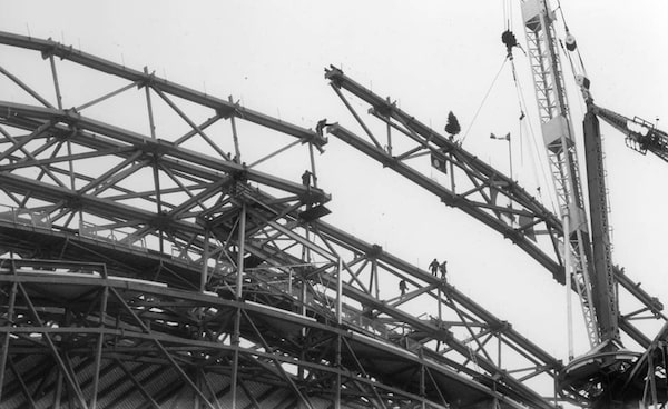 Steelworkers watch as a crane lowers a 130-foot, 30-ton truss into place on Dec. 14, 1988. The truss was used to connect the east and west sections of the SkyDome roof.Edward Regan/The Globe and Mail
