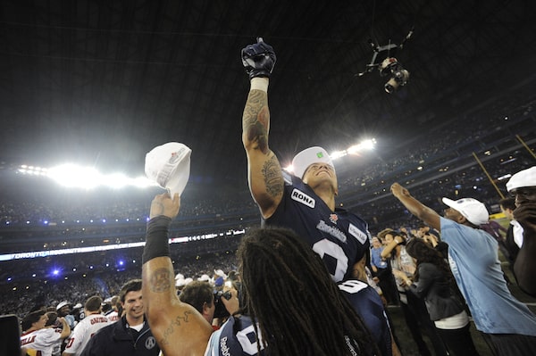 Chad Owens raises his hand high while celebrating the Toronto Argonaut's Grey Cup win over the the Calgary Stampeders at the Rogers Centre on Nov 25 2012.Fred Lum/The Globe and Mail