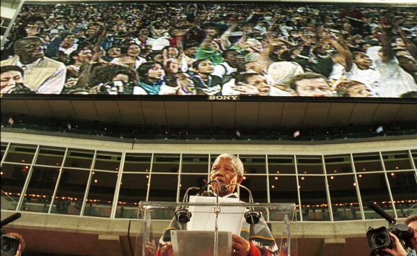 Nelson Mandela speaks to thousands of children in the SkyDome during his visit to Canada on Sept. 25, 1998.Tibor Kolley/The Globe and Mail