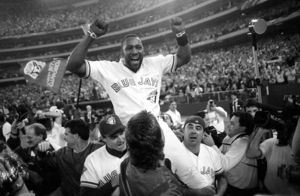 Joe Carter celebrates after hitting the World Series-clinching home run in Game 6 between the Toronto Blue Jays and Philadelphia Phillies on Oct. 23, 1993.Fred Lum/The Globe and Mail