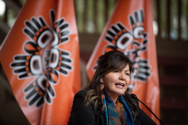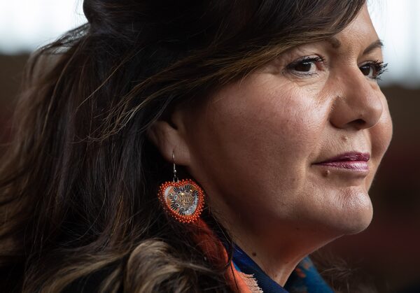 Tk'emlups te Secwepemc Kukpi7 (Chief) Rosanne Casimir wears earrings that say "Every Child Matters" as she listens during a news conference ahead of a ceremony to honour residential school survivors and mark the first National Day for Truth and Reconciliation, in Kamloops, BC..DARRYL DYCK/The Canadian Press