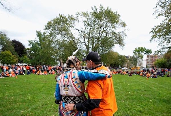 Henry Pitawanakwat from Wikwemikong Unceded Indian Reserve is hugged by his niece Brianna Olson Pitawanakwat during Canada's first National Day for Truth and Reconciliation, honouring the lost children and survivors of Indigenous residential schools, their families and communities, in Toronto.CARLOS OSORIO/Reuters