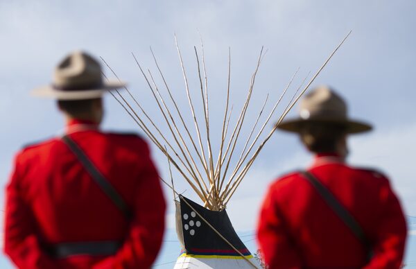 Two RCMP officer stand in front of a Blackfoot tipi on the Siksika Nation on September 30, 2021. The Blackfoot Siksika Nation recognized the first ever National Day for Truth & Reconciliation with a commemorative ride, a walk from the old residential school, words from nation elders, and traditional dancers.Gavin John/The Globe and Mail