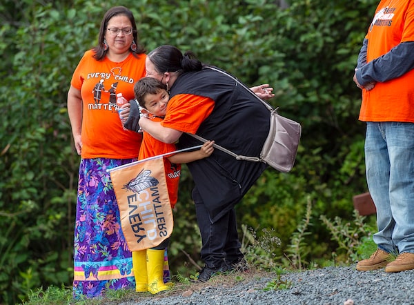 A young boy receives a hug as community members and area residents honour the National Day for Truth and Reconciliation at Millbrook First Nation near Truro, N.S.Andrew Vaughan/The Canadian Press