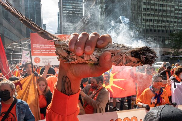 A man holds up an eagle feather and burns sweet grass as people take part in a march to mark the first National Day for Truth and Reconciliation in Montreal.Ryan Remiorz/The Canadian Press