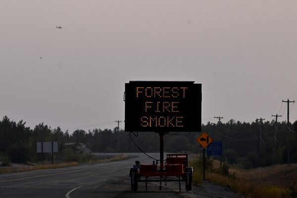 A helicopter carrying a water bucket passes a sign that warns of forest fire smoke outside Yellowknife.JENNIFER GAUTHIER/Reuters