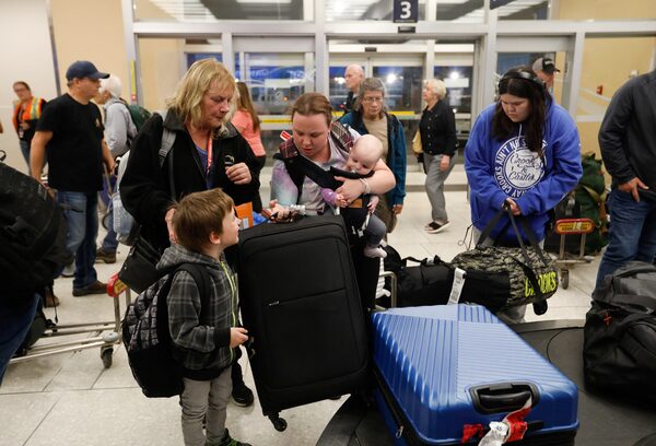Yellowknife evacuee Jamie Fradsham, her daughter Ivy Droesse, her mom Jackie Fradsham and son Sterling Droesse at Edmonton's airport.AMBER BRACKEN/Reuters