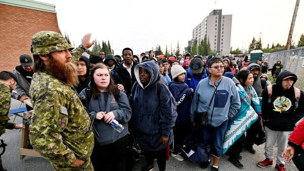 People line up outside a Yellowknife school to register to be evacuated as wildfires threaten the Northwest Territories’ capital city.JENNIFER GAUTHIER/Reuters