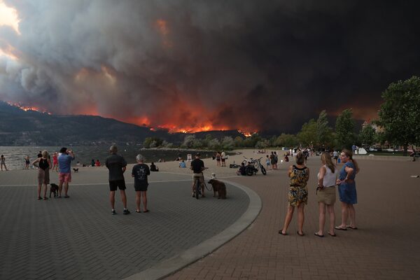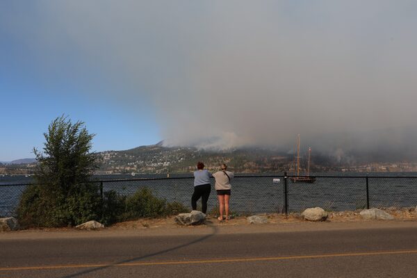 A group of people watch from downtown Kelowna, B.C., as the McDougall Creek wildfire burns.Aaron Hemens/The Globe and Mail