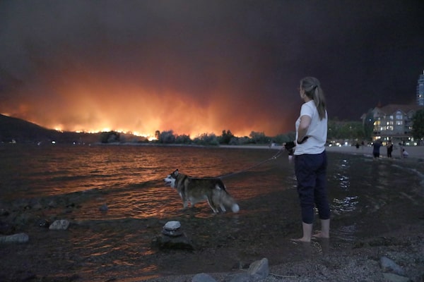 Woman and her dog watching the wildfire from downtown Kelowna, B.C.Aaron Hemens/The Globe and Mail