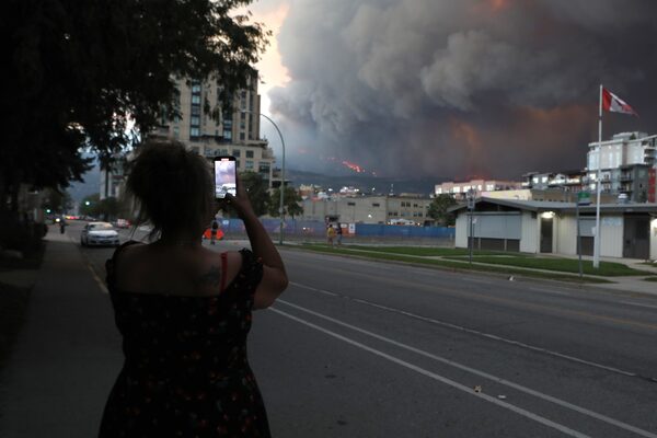 A resident takes a photo of the burning McDougall Creek wildfire from downtown Kelowna, B.C.Aaron Hemens/The Globe and Mail