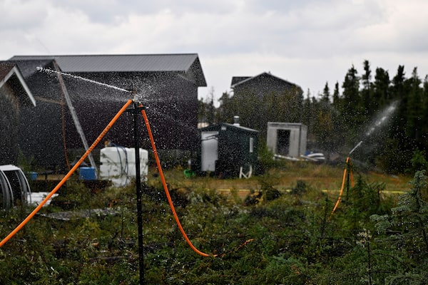 Residents set up sprinklers to protect their homes in the neighbourhood adjacent to Grace Lake in Yellowknife.JENNIFER GAUTHIER/Reuters