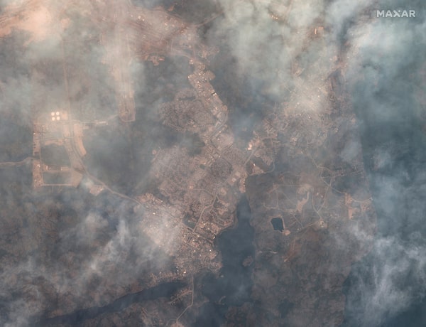 A satellite image shows smoke rising over Yellowknife, Northwest Territories on August 15, 2023.MAXAR TECHNOLOGIES/Reuters