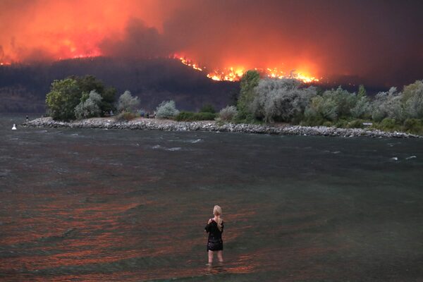 A person stands in Okanagan Lake near downtown Kelowna, B.C., as the McDougall Creek wildfire burns.Aaron Hemens/The Globe and Mail