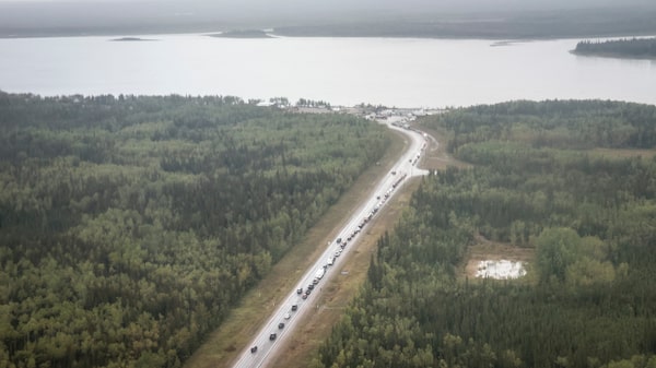 A long line of cars evacuating from Yellowknife wait to fill up with gas at Fort Providence, N.W.T.,Jeff McIntosh/The Canadian Press