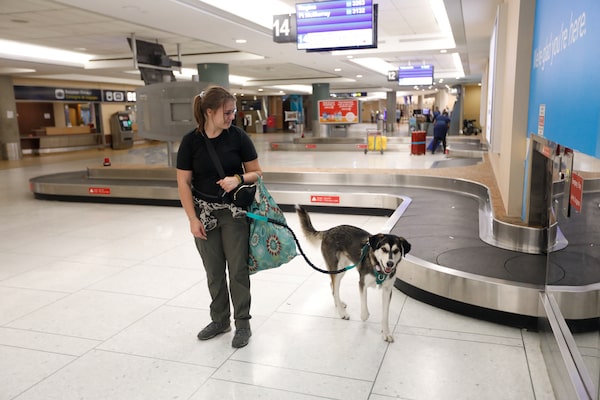 An evacuee from Yellowknife arrives at the airport in Edmonton with her dog.AMBER BRACKEN/Reuters