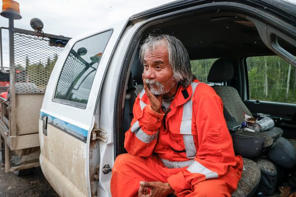 Keith Swirlle rests in his truck after directing traffic from Yellowknife in Fort Providence, N.W.T.Jeff McIntosh/The Canadian Press
