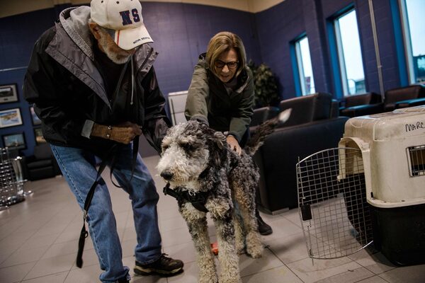Darlene and Wes Churchill are reunited with their son's dog, Rosco, in Edmonton, from a plane in Yellowknife.ANDREJ IVANOV/AFP/Getty Images
