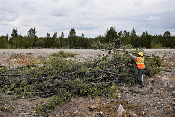 Volunteer Edmund Gill clears dry branches to create a firebreak in Yellowknife.JENNIFER GAUTHIER/Reuters