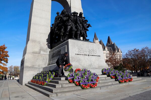 A man lays a wreath of flowers ahead of a ceremony at the National War Memorial on Remembrance Day in Ottawa.PATRICK DOYLE/Reuters