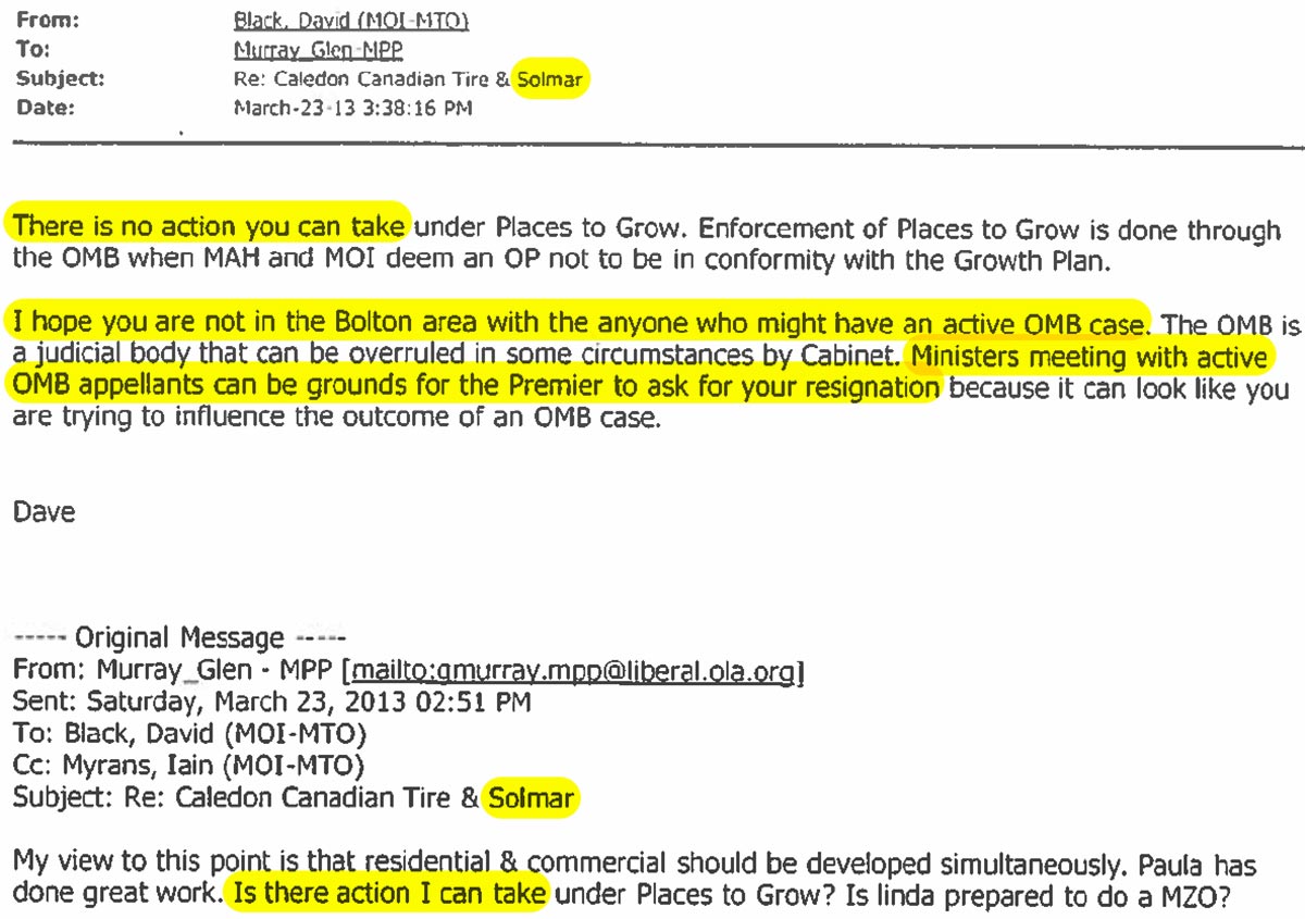 “I hope you are not in the Bolton area with anyone who might have an active OMB case,” Mr. Black e-mailed to Mr. Murray. “Ministers meeting with active OMB appellants can be grounds for the Premier to ask for your resignation because it can look like you are trying to influence the outcome of an OMB case.”