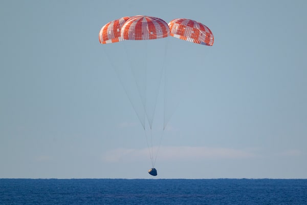 Assisted by parachutes, the Artemis II crew module, dubbed Integrity, touches down in the Pacific Ocean at the end of the mission on Friday.BILL INGALLS/AFP/Getty Images