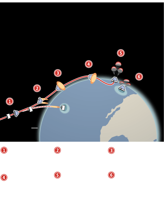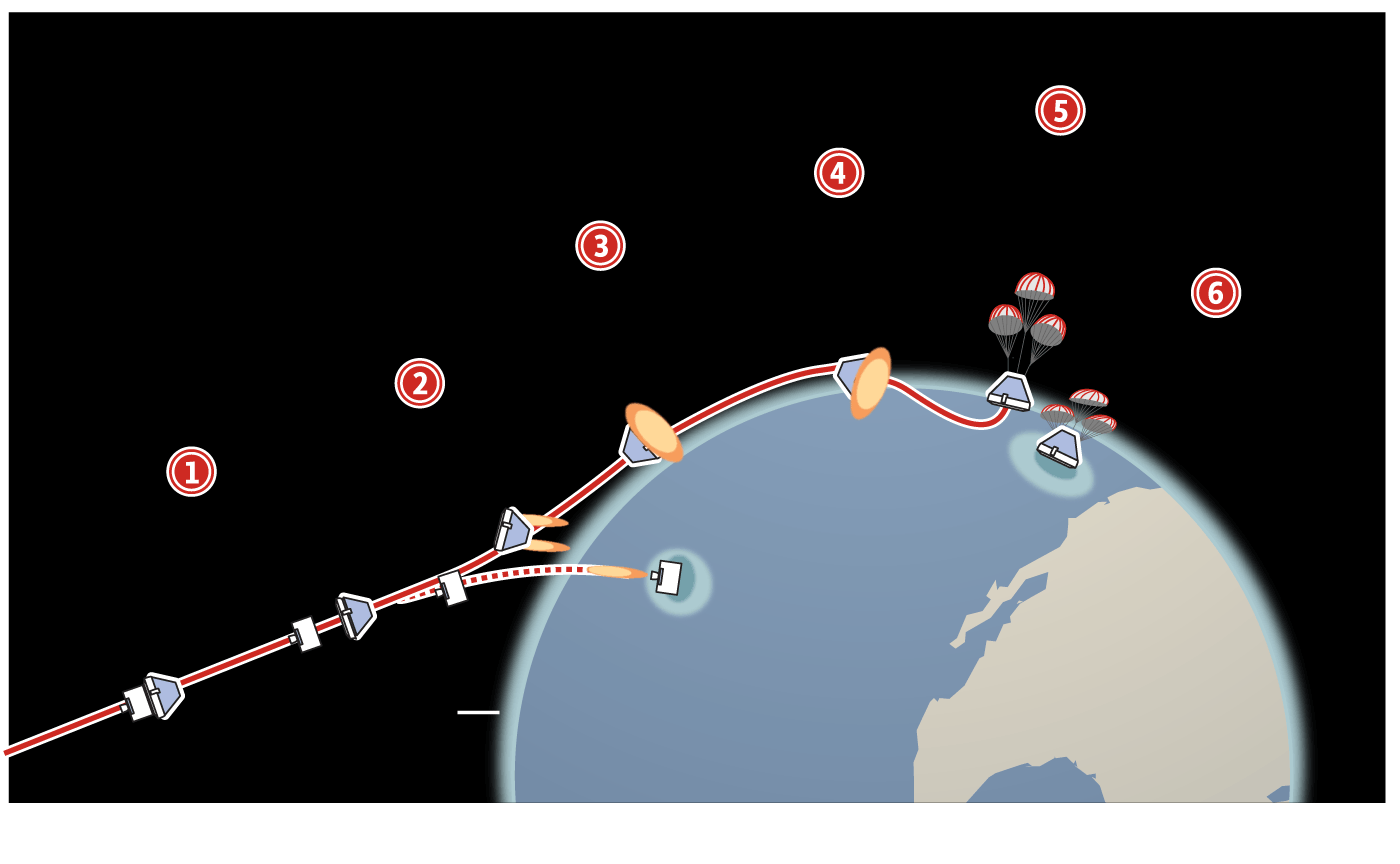 Upon emerging from blackout, a protective top cover on the capsule will be jettisoned so that parachutes can be deployed. These come out in sequence to help slow the capsule further until the three main parachutes open at about 1.8 kilometres above the water.