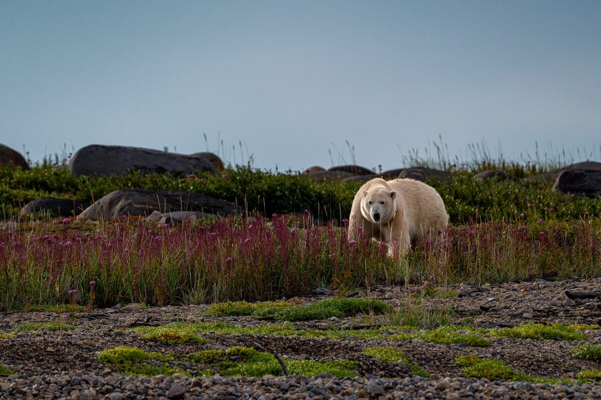 Fortunately, the earlier threat of bad weather seems to have abated. I scan the estuary toward the opposite bank where polar bears sometimes make an appearance. Today there are no bears, but I can see belugas surfacing in the distance. They appear as brief flashes of white among the waves. Before long, groups of a dozen or more are passing by, often moving straight and swiftly through the water as they chase schools of small fish. For now they seem too preoccupied to take much notice of us.
