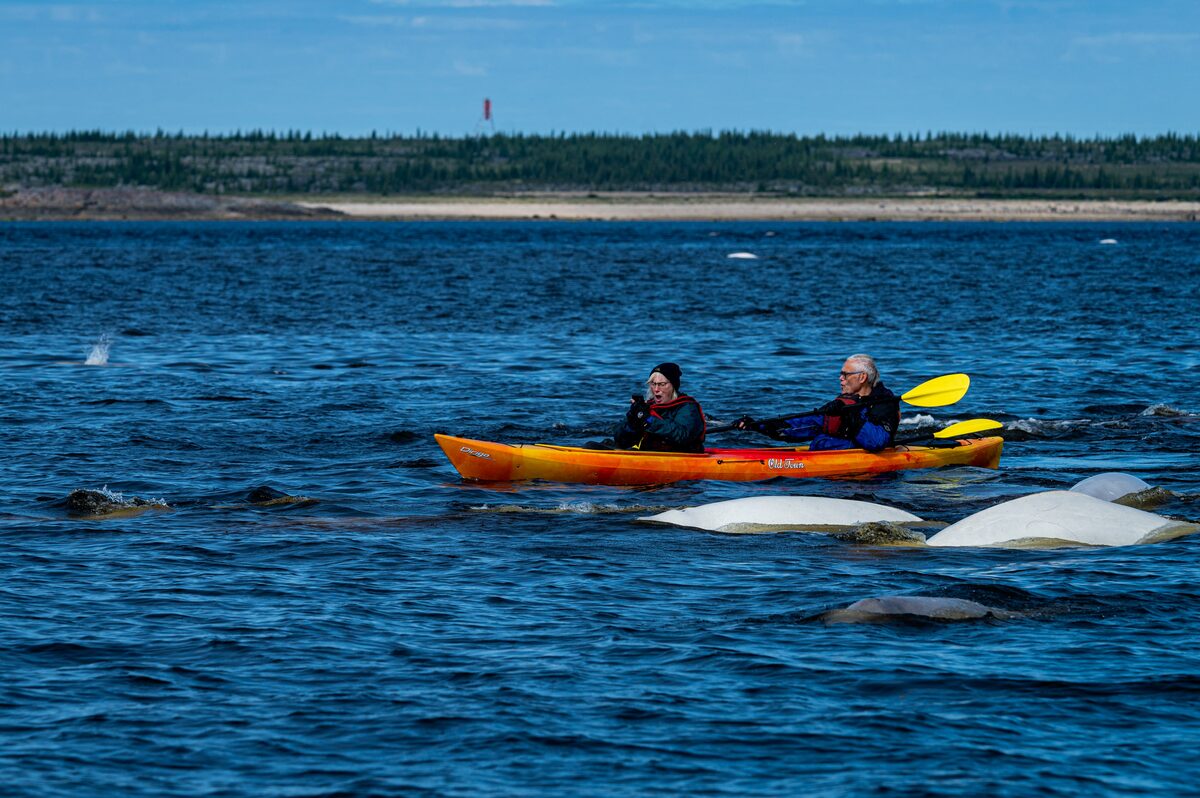 The Churchill belugas in particular are known for their curiosity and for interacting with humans, frequently hobnobbing with those who venture out to see them in inflatable tour boats or kayaks.